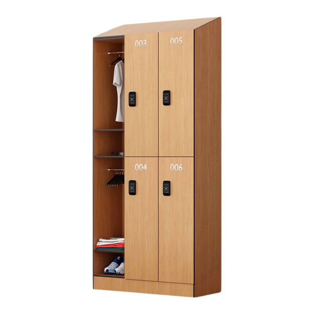 Moisture-resistant material options (HPL) adapt well to the humid environment of gym locker rooms. The sloping top prevents water accumulation from post-workout showers, protecting stored clothes and gear from mold and water damage.